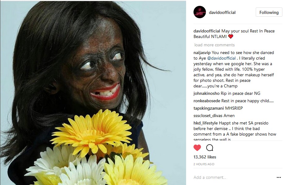 Nigerian Musician, Davido paid tribute to Ontlametse Ntlami Phalatse, the 18-year old South African progeria sufferer has died.